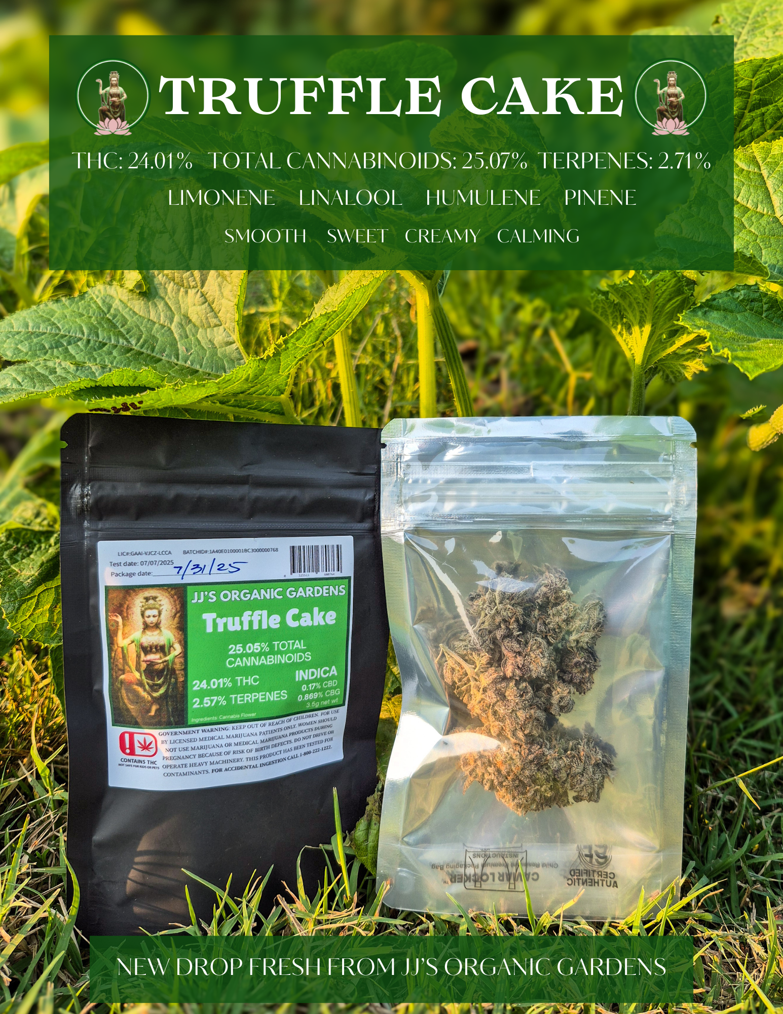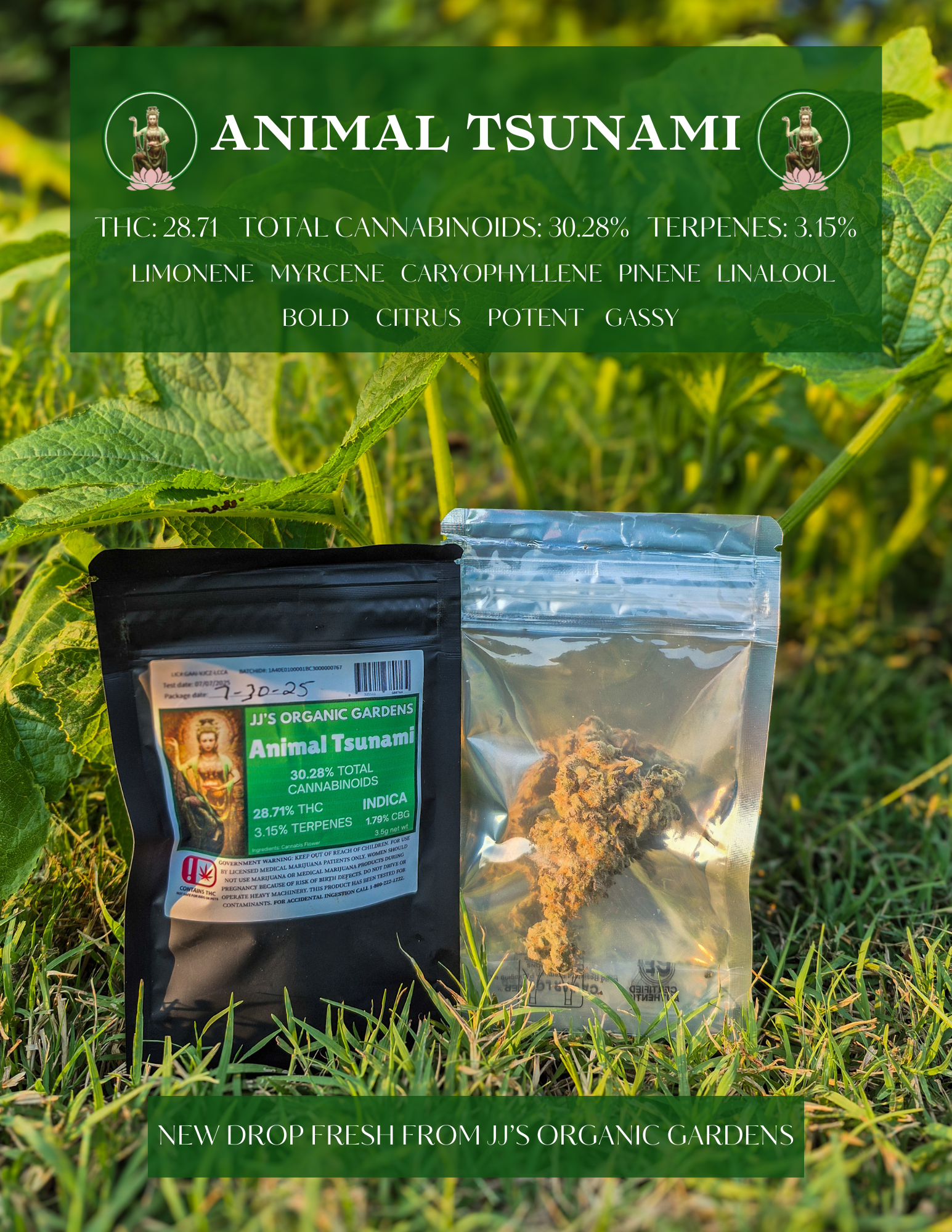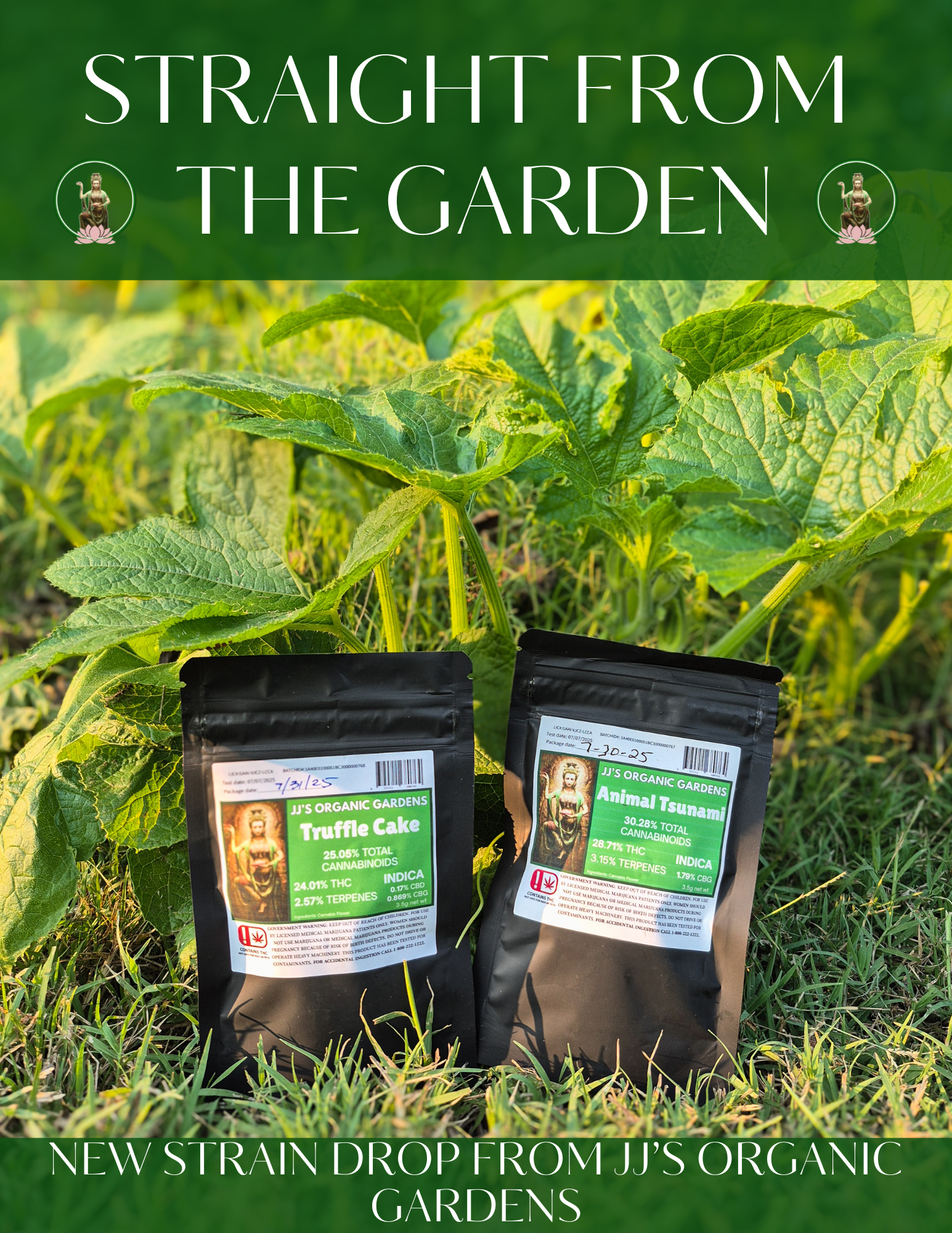 Straight from the living soil beds of JJ’s Organic Gardens comes a limited harvest drop rooted in purity, potency, and purpose. These two new strains—Animal Tsunami and Truffle Cake—are cultivated without pesticides, enriched by organic amendments, and protected by beneficial insects. No shortcuts. No synthetics. Just nature in full expression. Animal Tsunami crashes in with bold flavor, potent effects, and a powerful full-body surge that washes away tension.