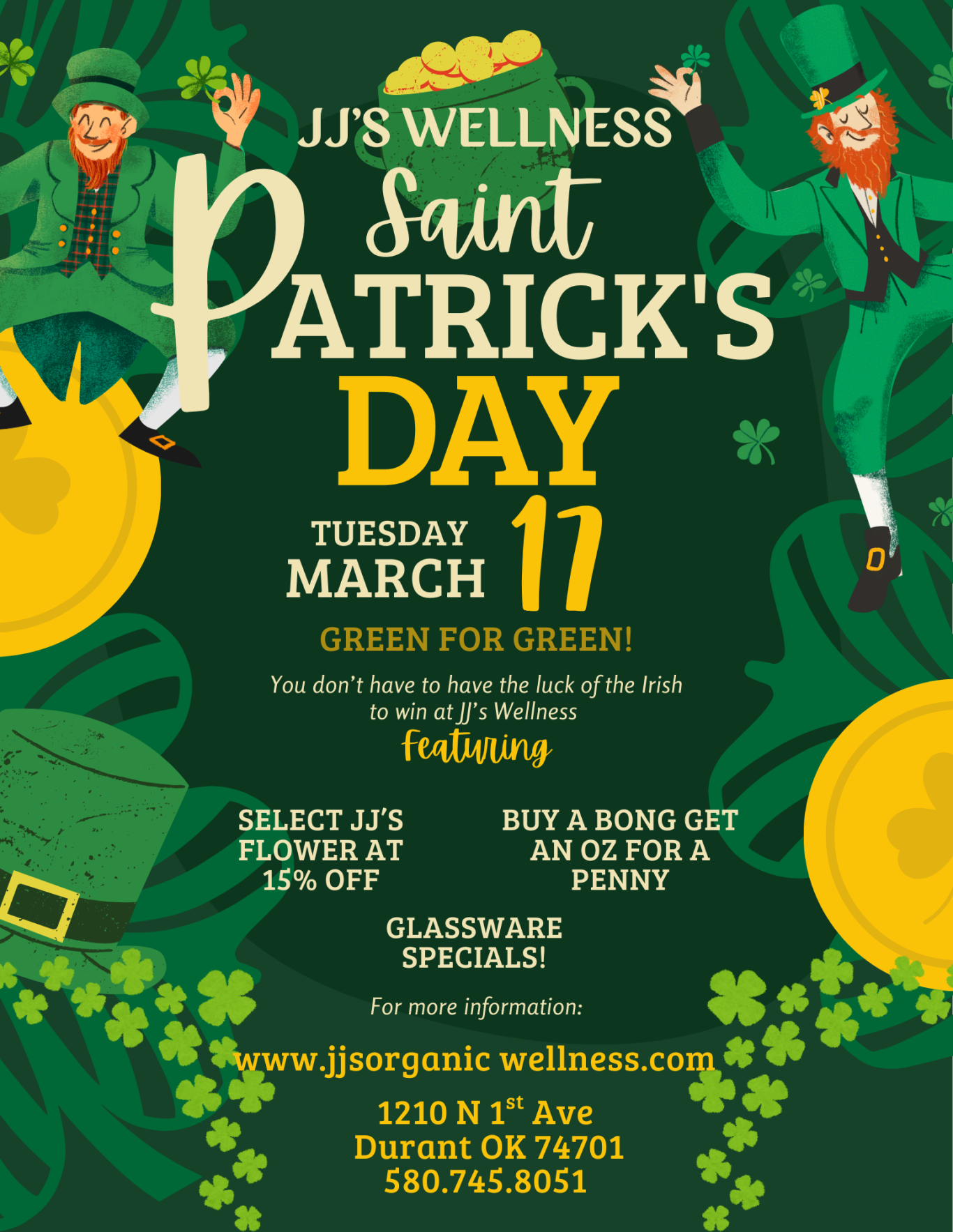 Come out and join us Tuesday March 17th for our St. Patrick's Day sale, where you don't need the luck of the Irish to win! We have select JJ's Flower 15% off and several glassware promotions, including a Penny ounce with Bong purchase! So follow the end of the rainbow to your Pot of Gold at JJ's Wellness, Where we always have the best product and customer service at the best price!